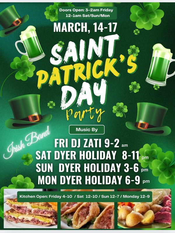 Dj Zati Friday Irish Music with Dyer Holiday Saturday 8-11 Sunday 3-6. Monday 6-9 All Irish menu Saturday, Sunday, & Monday. Kitchen opens at noon Saturday, Sunday and Monday